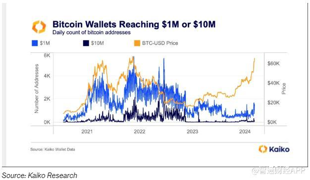 据加密货币分析公司Kaiko Research,比特币创纪录的涨势似乎每天都在创造大约1,500个新的“百万富翁钱包”。这些钱包是比特币区块链上的数字地址,用户可以在其中存储加密货币。由于网络是公开的,不受任何中央中介机构控制,因此可以访问诸如钱包持有的代币数量之类的数据。然而,这些地址是匿名的,这使得很难区分它们是否由个人或实体控制。