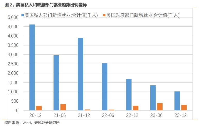 疫情以来,美国私人部门就业快速修复,但随着加息周期的开启,其新增就业逐步放缓。而政府部门对周期变化相对不敏感,整体就业水平自2022年下半年以来变化不大。两者就业趋势的差异是近半年来小非农(ADP)和非农(NFP)差异愈发明显的重要原因。