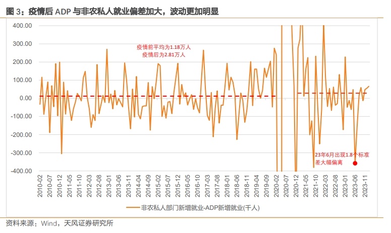 且两者出现大幅偏差的情况也更加常见,比如2023年6月,ADP新增就业为54.3万人,而同期非农私人部门新增就业仅有18.5万人,两者之间出现了1.8个标准差的大幅偏离。而疫情前的10年,超过1.8个标准差的偏离水平也仅出现过三次。