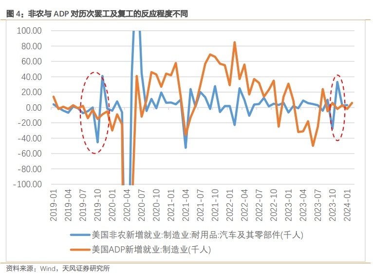 去年的全美汽车工人(UAW)大罢工于2023年9月15日开始、2023年10月30日结束。非农就业里的汽车及零部件行业在10月录得-2.75万人后,随着罢工的结束,11月录得3.3万人增长;而ADP就业并未明显反应。