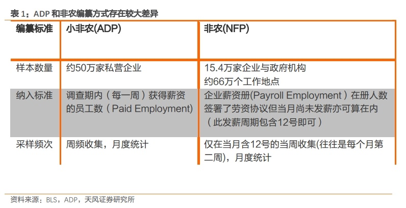 两者最直接的区别是构成结构的不同:小非农(ADP)仅包含私人部门就业,而非农(NFP)既包含私人部门又包含政府部门就业。因此当私人部门和政府部门的就业趋势出现差异,或政府就业遇到季节性变化时,小非农(ADP)和非农(NFP)会产生背离。