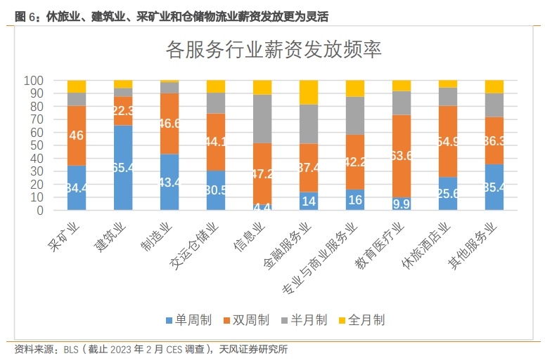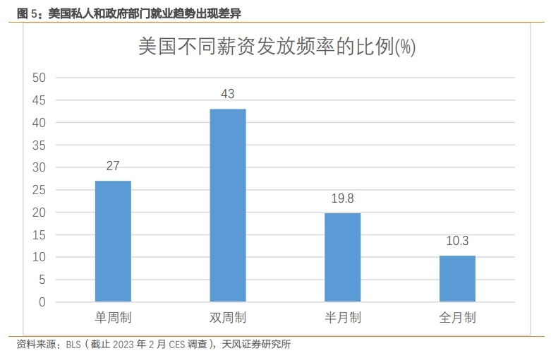 周薪和双周薪工作在美国的占比为70%,因此ADP周度采集数据可以更好地捕捉就业的真实情况。尤其是那些兼职员工较多、临时性用工需求较高的行业,只要受雇佣者在该月任意一周获得薪资收入即可被算入当月就业。而在非农视角下,如果该员工没有在12号当周处于企业薪资册中,就不会被计算为就业。