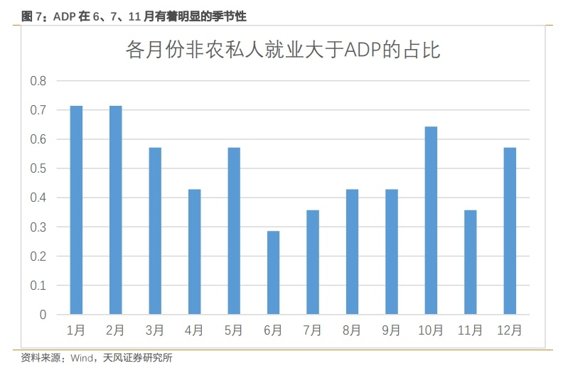 另外,小非农(ADP)就业在每年6、7、11这三个月有明显的季节性,原因是6、7月正值暑假开端,学生暑期打短工的情况较多,同时休闲旅游等行业的暑期临时用工需求增加;而11月恰逢感恩节假期,叠加随后12月圣诞新年假,各行业往往也开始增加临时用工需求。