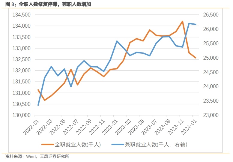 这和美国疫后就业活动的新特点有关。疫情以来,美国兼职(包括自愿与非自愿)就业数小幅持续增加,但全职就业数快速修复后有所停滞。特别是2023年6月-2024年1月期间,非农口径下的兼职人数增加了约109万人,而全职就业人数减少了约124万人。