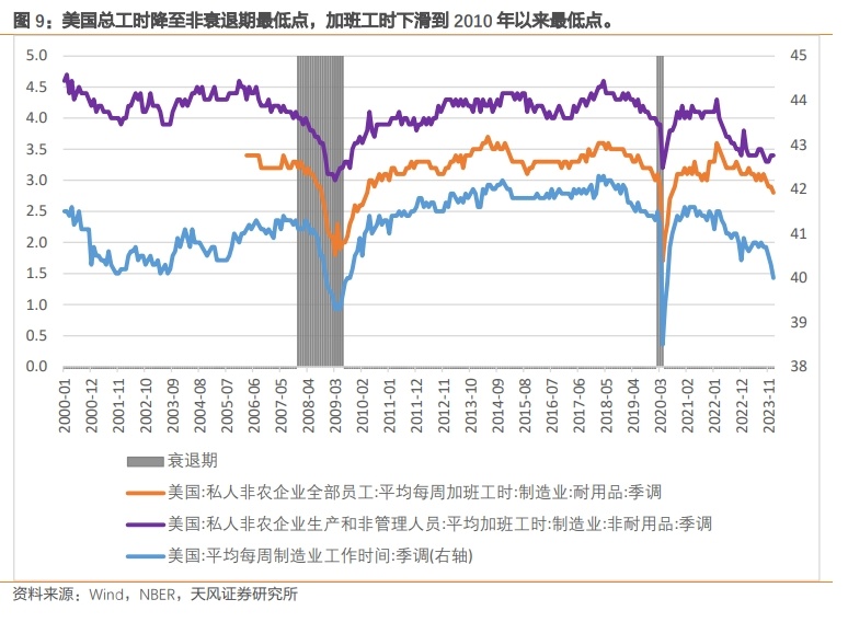 灵活的招工政策体现为工作时长的持续下行。制造业部门总工作时长降至非衰退期最低点,耐用品和非耐用品生产部门的加班时长更是下滑到了2010年以来的最低点,兼职就业人数持续扩大。