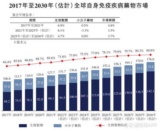 弗若斯特沙利文数据显示,2022年全球自身免疫疾病药物市场规模约1317亿美元,自免领域已然成为全球仅次于肿瘤的第二大治疗领域;预计到2030年将增至1760亿美元,其中中国市场受益于创新疗法的进步及潜在医疗需求,料将录得更高增速。
