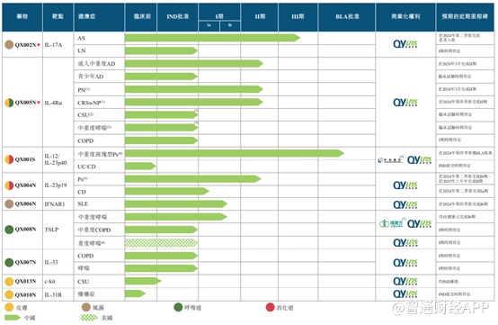 另一个核心产品QX005N旨在抑制IL-4Rα,该靶点是一种经充分验证可应用于广泛适应症的靶点,公司已获得七种适应症的IND批准,乃中国IL-4Rα靶向候选药物中适应症最多的药物。目前QX005N针对AD(特应性皮炎)和PN(结节性痒疹)的III临床沟通申请已经递交,用于治疗CRSwNP(慢性鼻窦炎伴鼻息肉)的II期临床试验亦已于2023年4月开始。