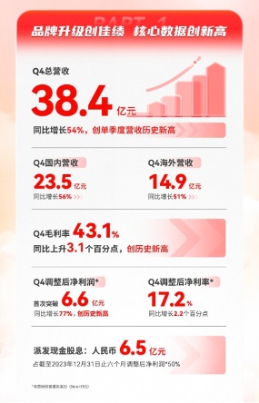 北京时间2024年3月12日,名创优品集团(NYSE:MNSO,HKEX:9896)公布了2023年第四季度财报。本季度,名创优品集团实现持续增长与创新引领,全球营收、净利润、毛利率等多项经营指标都取得历史性突破。