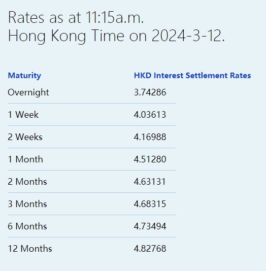 智通财经APP获悉,3月12日,港元拆息全线下跌,其中,隔夜息报3.74286%,续创3月6日以来最低,一周拆息降至4.03613%。与楼按相关的一个月拆息两连跌,报4.51280%,创近一周新低。