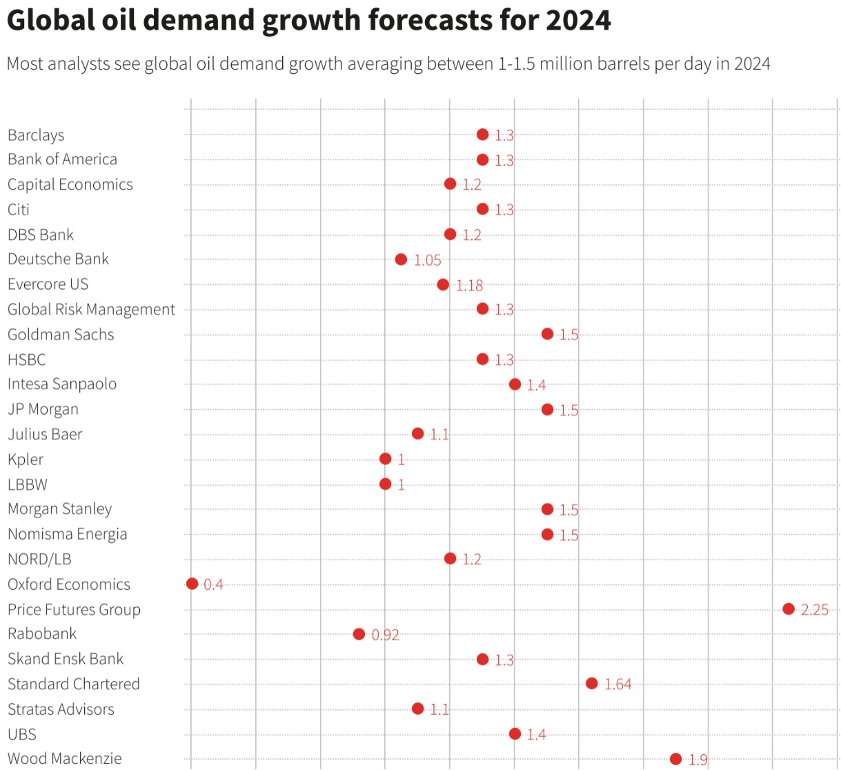 来自银行和研究公司的26位分析师对2024年需求增长的预测显示,这些预测的平均值为130万桶/天,更接近IEA的预测。