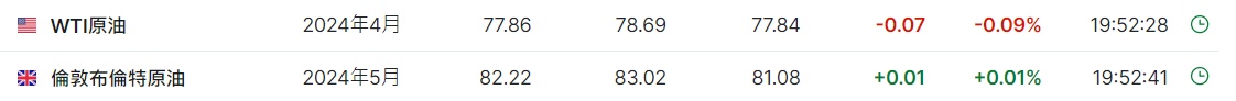 3. 截至发稿,WTI原油跌0.09%,报77.86美元/桶。布伦特原油涨0.01%,报82.22美元/桶。