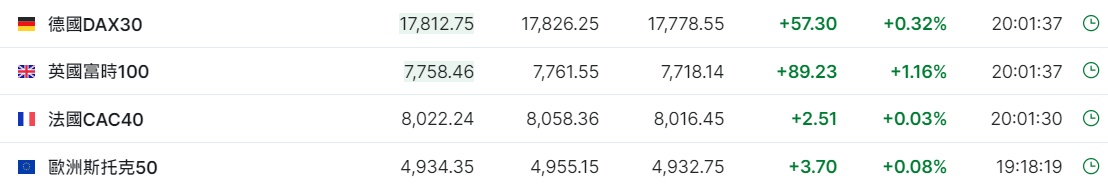 2. 截至发稿,德国DAX指数涨0.32%,英国富时100指数涨1.16%,法国CAC40指数涨0.03%,欧洲斯托克50指数涨0.08%。