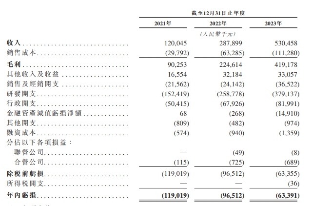 财务方面,于2021年度、2022年度及2023年度,公司的收入分别约为人民币1.20亿元、2.88亿元及5.30亿元;同期,该公司的年内亏损分别约为人民币1.19亿元、9651.2万元及6339.1万元。