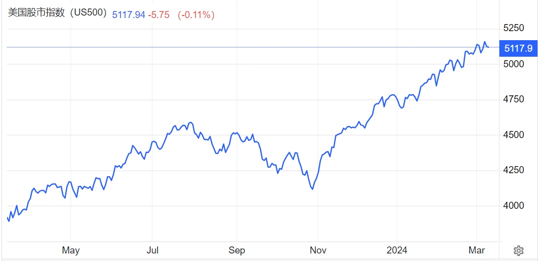 今年以来,美股基准股指——标普500指数上涨超8%,并且自今年以来屡创新高,不断刷新历史新高点位,主要受市场围绕人工智能的投资狂潮和美联储今年降息预期的大力推动。截至周一美股收盘,标普500指数收于5117.94点位。
