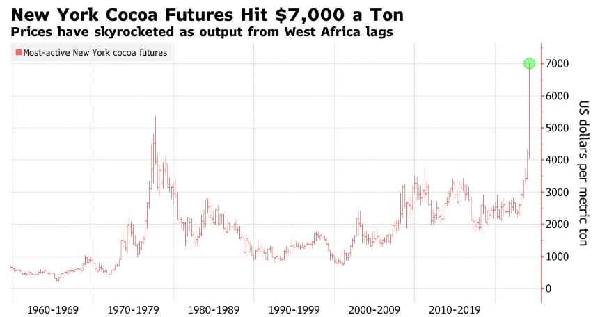 智通财经获悉,可可豆期货价格周二在美国交易时间盘中创下新高,首次突破7000美元大关。对供应的担忧推动了价格上涨,但对巧克力生产商来说,没有任何缓解的迹象。最活跃的可可合约周二大涨5.5%,至7096美元,今年迄今的涨幅约为68%。成本上升给巧克力生产商带来了压力,由于恶劣的天气条件和树木老化、患病等结构性问题,“象牙海岸”科特迪瓦和加纳的产量继续下降。