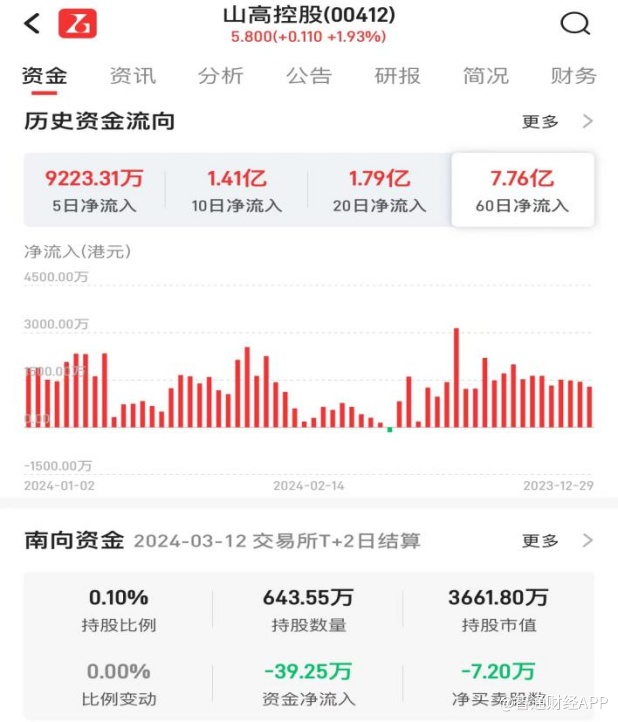 在此背景下,二级市场上的投资者亦抢抓投资机遇,为山高控股投来“信任票”。智通财经APP数据显示,截至3月12日近60个交易日,山高控股股票获得7.76亿港元资金净流入,公司股价月内最大涨幅超过11%。截至3月8日,高山控股,已获得南向资金持股643.55万股。