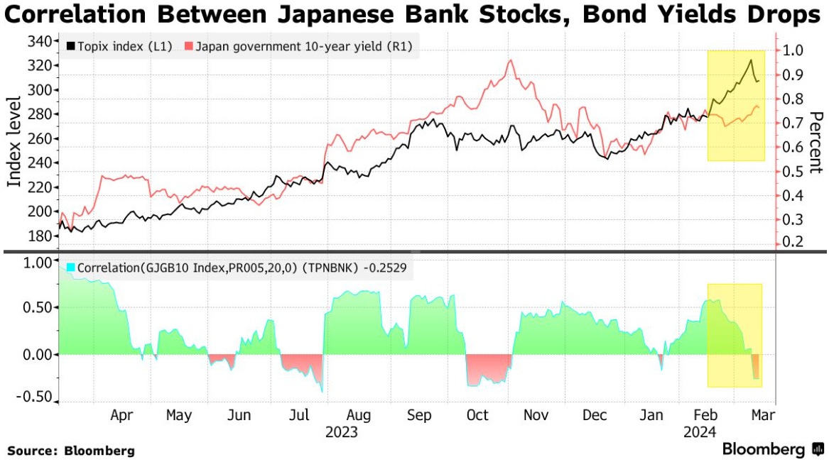 但最近几周,银行股与收益率之间的相关性有所减弱,表明收益率上升的推动作用正在减弱。自上周五以来,东证银行指数与大盘一起下跌了5%以上,尽管有关日本央行将在下周召开政策会议之前加息的猜测越来越多。