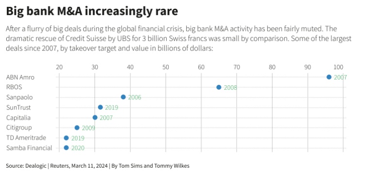 瑞银对瑞信的收购是自2008年金融危机以来最大的银行业合并,当时欧洲和美国的一系列银行被迫进行紧急合并。