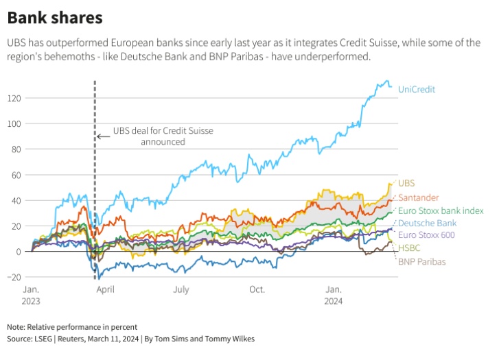 但自那以后,股价一路飙升,瑞银和意大利联合信贷银行分别上涨了60%和近70%。法国巴黎银行(BNPQY.US)和德意志银行的股价表现不佳,但仍有所上涨。