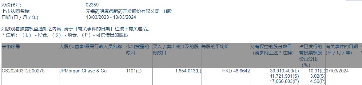 智通财经APP获悉,香港联交所最新资料显示,3月7日,小摩增持药明康德(02359)165.4013万股,每股作价46.9642港元,总金额约为7767.94万港元。增持后最新持股数目约为3991.04万股,最新持股比例为10.31%。