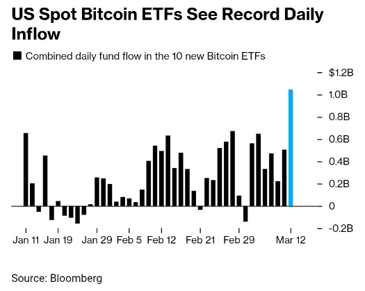智通财经APP获悉,受与比特币相关的美国ETF创纪录资金流入的推动,比特币在六天内第四次创下历史新高。