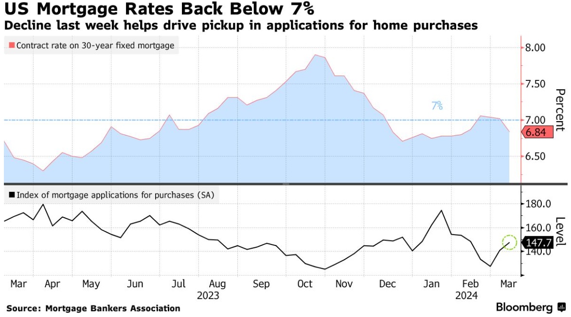 智通财经APP获悉,美国抵押贷款银行家协会(MBA)周三公布的数据显示,截至3月8日当周,30年期固定抵押贷款合约利率下降18个基点,至6.84%,为近三个月来最大降幅。MBA的住房抵押贷款申请指数上升4.7%,至147.7的四周高点。