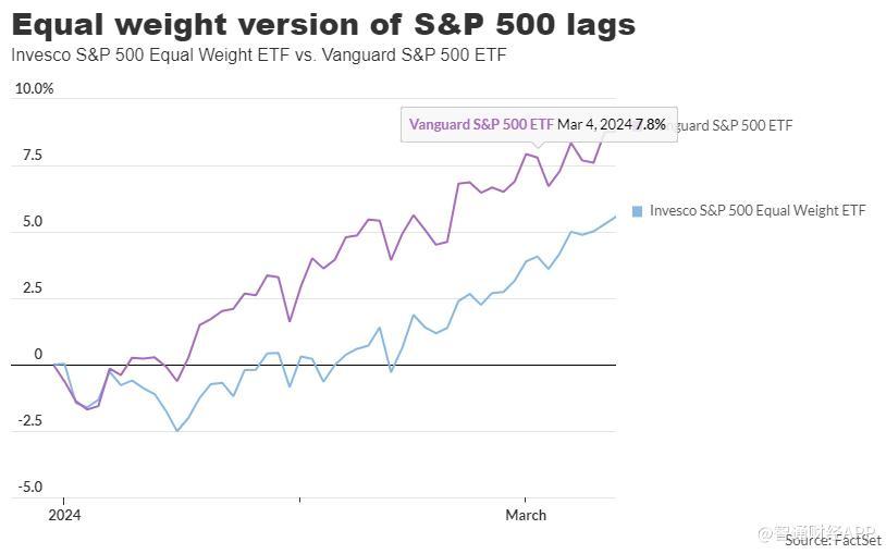 标普500指数是一个市值加权指数,像英伟达这样市值巨大的公司在该指数中占有很大比重。该指数的等权重版今年表现落后。