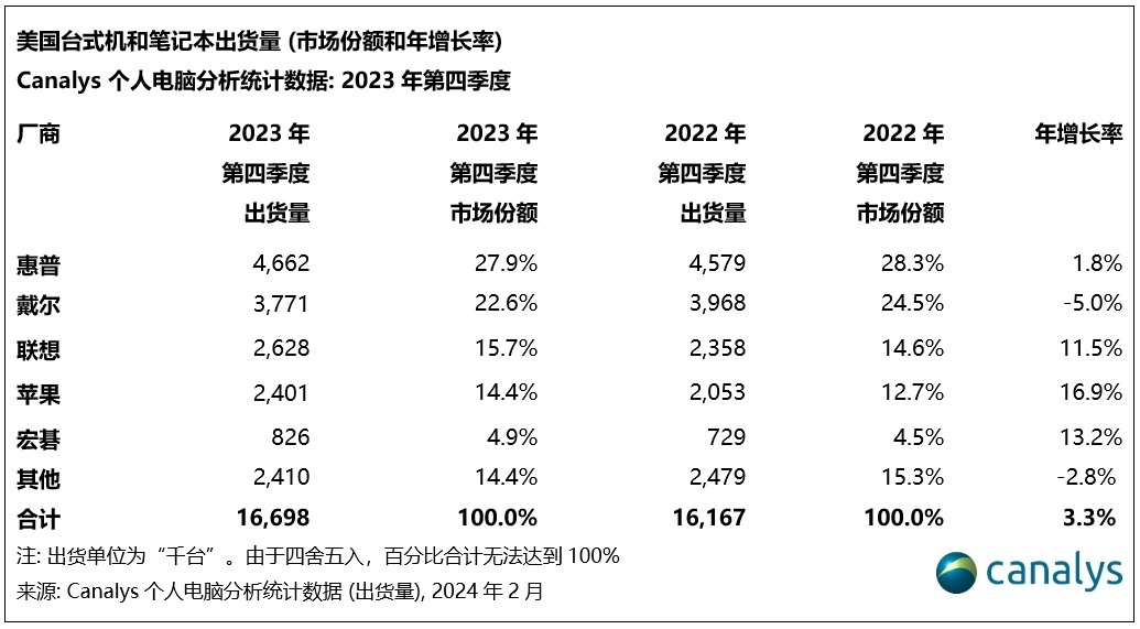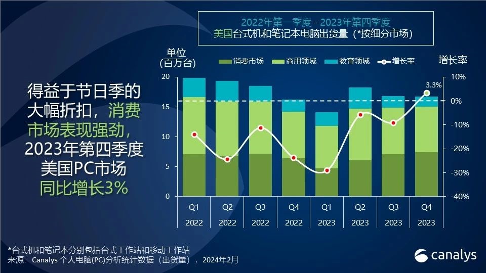 智通财经APP获悉,Canalys发文称,2023年第四季度,美国个人电脑(PC)(包含台式机、笔记本和工作站)出货量同比增长 3.3%,达到1670万台。消费市场受节日季推动,同比增长15.1%。商用领域出货同比小幅下降2.2%,而教育领域降幅较大,同比下降13.4%。美国PC市场反弹信号,预示着市场在未来两年将迎来增长,2024年和2025年美国