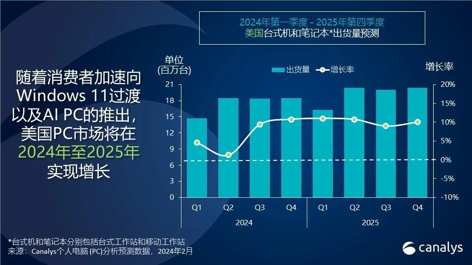 PC 市场表现将呈现强劲态势。Canalys预计,2024年和2025年美国PC市场的同比增长将分别达到 7% 和 10%。