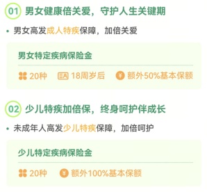 1、保障疾病种类丰富,四大可选责任灵活搭配,一次性覆盖不同生命周期家庭成员。该产品保障覆盖0岁(出生满28天)~60周岁人群高发的120种重疾、20种中症、50种轻症,以及添加了恶性肿瘤重度关爱保险金、男女特定疾病保险金、少儿特定重大疾病保障以及失能收入损失津贴等可选保险责任,保障范围更加全面,为家庭提供全方位保障。如添加男女特定疾病保险金,被保人在满18周岁后,若罹患特定的20种疾病,可额外获赔50%基本保额。