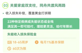 特别需要关注的是,可选责任中,首次确诊恶性肿瘤(重度),如3年后再次确诊,可获额外100%基本保额;年满18周岁且未满66周岁,罹患22种失能特定疾病或达到失能状态或全残,每月按1%基本保额给付失能收入损失津贴,60次为限。