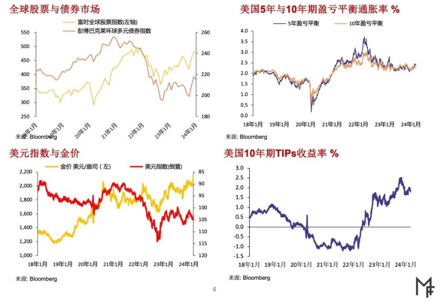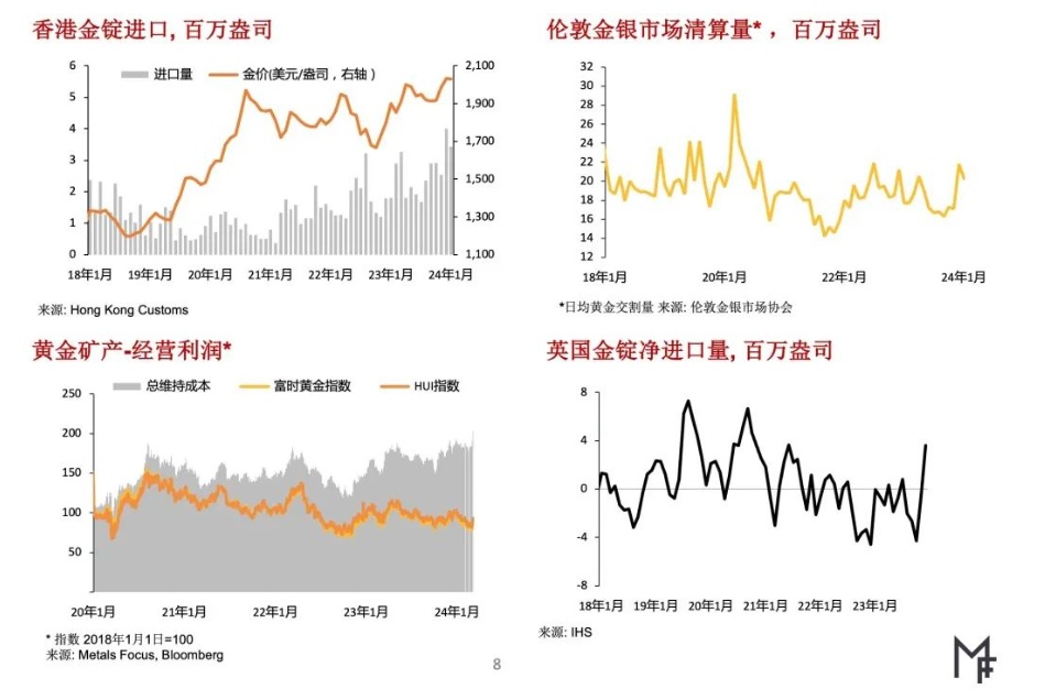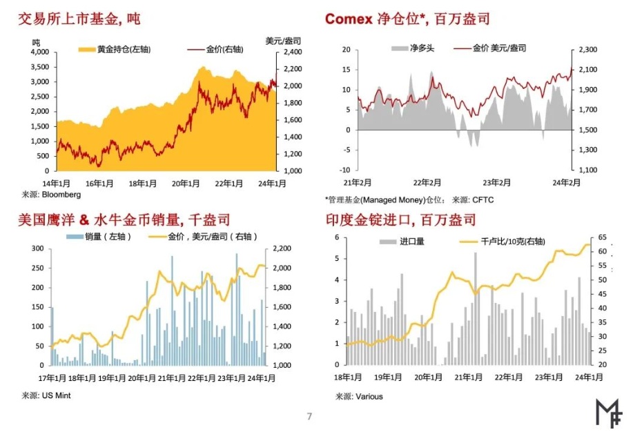 如上期月报所述,2024年初时市场对美联储的降息步伐预期较为激进。因此2月份该预期快速发生转变并不太出人意料。不过令人意外的是,利率预期转变之下2月份金价仅短暂跌破2,000美元/盎司。