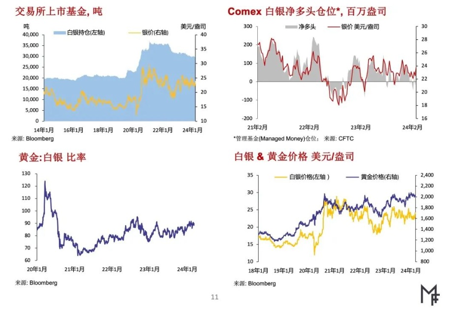 2月份白银价格在22-23.5美元/盎司区间内震荡,与1月份的市况类似。受金价飙涨的带动,3月早期银价终于突破上行。撰写本报告之时银价已站上24美元/盎司,创2023年12月中旬以来新高。