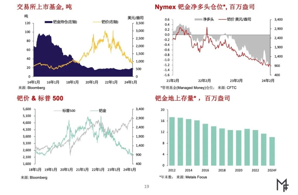 为更好反映本年迄今钯价表现疲软的情况,Metals Focus已将2024年一季度的钯价预测值下调。预计2024年供应短缺量将达120万盎司,铂价走强,空头仓处于高位等因素将支撑2024年剩下时段内钯价较当前价位小幅上涨。