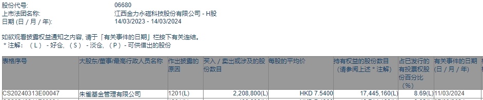 智通财经APP获悉,香港联交所最新资料显示,3月11日,朱雀基金减持金力永磁(06680)220.88万股,每股作价7.54港元,总金额约为1665.44万港元。减持后最新持股数目约为1744.52万股,最新持股比例为8.69%。