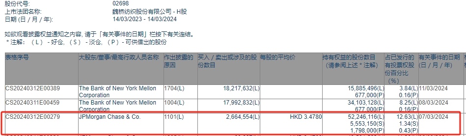 智通财经APP获悉,香港联交所最新资料显示,3月7日,小摩增持魏桥纺织(02698)266.4554万股,每股作价3.4780港元,总金额约为926.73万港元。增持后最新持股数目约为5224.61万股,最新持股比例为12.63%。
