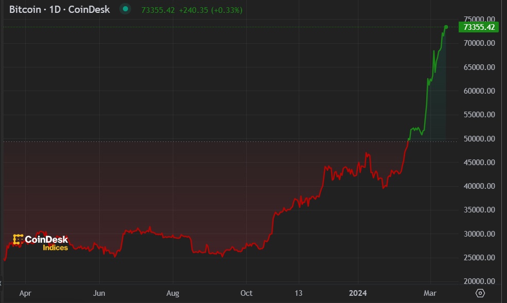 比特币价格当前已突破7.3万美元大关,又一次刷新历史新高。随着比特币“减半”时间的临近,比特币近期涨势如虹,华尔街对比特币价格的预期可谓越来越激进,7.3万美元也许才刚到山腰。华尔街知名投资机构伯恩斯坦的分析师们自信扬言:比特币涨势才刚刚开始,预计到明年年中有望涨到15万美元。