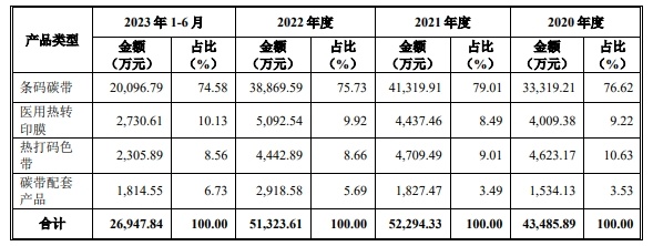 据招股书显示,卓立股份是一家主要从事热转印碳带等自动识别材料的研发、生产和销售的高新技术企业。公司主要产品包括条码碳带、医用热转印膜、热打码色带及碳带配套产品等。公司主要产品依靠热转印技术,即通过计算机电信号或机械加热的方式对热转印碳带上特定信息区域的高分子材料组成的转印涂层进行熔融,将赋有大量电子信息的条形码、二维码、字符、其它图像转印至各类受印介质上,使电子信息与赋码物体绑定,由自动识别设备进行信息读取。