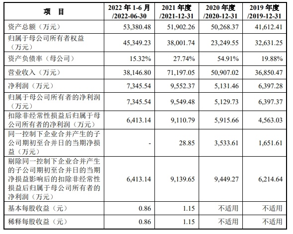 财务方面,于2019年、2020年、2021年、2022年1-6月,公司实现营业收入分别约为3.69亿元、5.09亿元、7.12亿元、3.81亿元;同期,公司实现净利润分别为6397.28万元、5131.46万元、9552.37万元、7345.54万元。