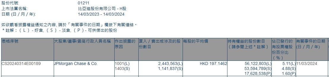 智通财经APP获悉,香港联交所最新资料显示,3月11日,小摩增持比亚迪股份(01211)244.3563万股,每股作价197.1462港元,总金额约为4.82亿港元。增持后其持股数目约为5612.28万股,最新持股比例为5.11%。