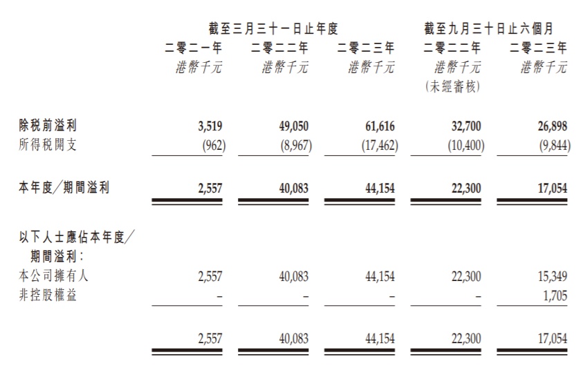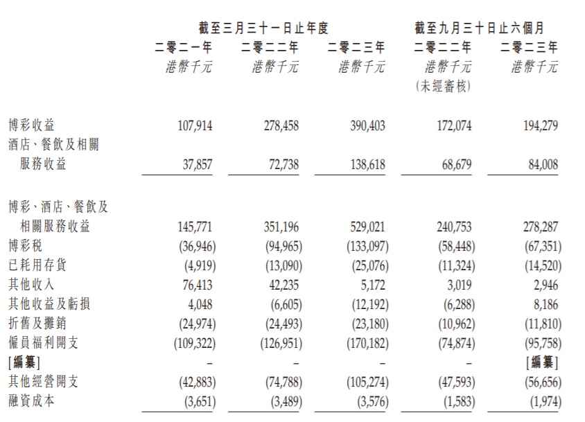 财务方面,于2021年截至3月31日止年度、2022年截至3月31日止年度、2023年截至3月31日止年度,2023年截至9月30日止6个月,公司在博彩、酒店、餐饮及相关服务收入分别约为港币1.46亿元、3.51亿元、5.29亿元、2.78亿元;同期,公司净利润分别为港币255.7万元、4008.3万元、4415.4万元、1705.4万元。