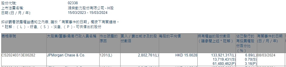 智通财经APP获悉,香港联交所最新资料显示,3月8日,小摩减持潍柴动力(02338)280.2761万股,每股作价15.0028港元,总金额约为4204.93万港元。减持后最新持股数目约为1.34亿股,最新持股比例为6.89%。
