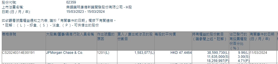 智通财经APP获悉,香港联交所最新资料显示,3月11日,小摩减持药明康德(02359)158.3077万股,每股作价47.4464港元,总金额约为7511.13万港元。减持后最新持股数目约为3859.07万股,最新持股比例为9.96%。