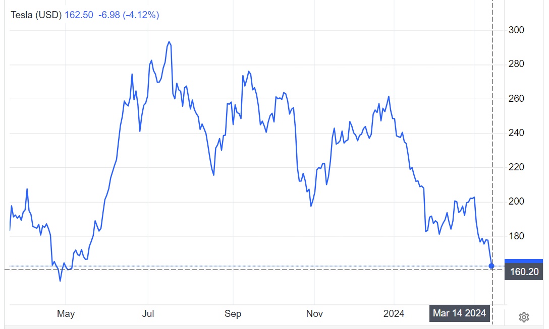 特斯拉周三收跌4.12%,收于10个月来的最低点162.5美元。2024年至今,该股已经下跌超34%,与美股大盘——标普500指数上涨8.3%的涨势相差甚远,同时远逊于涵盖微软、苹果和谷歌等科技股的纳斯达克100指数。