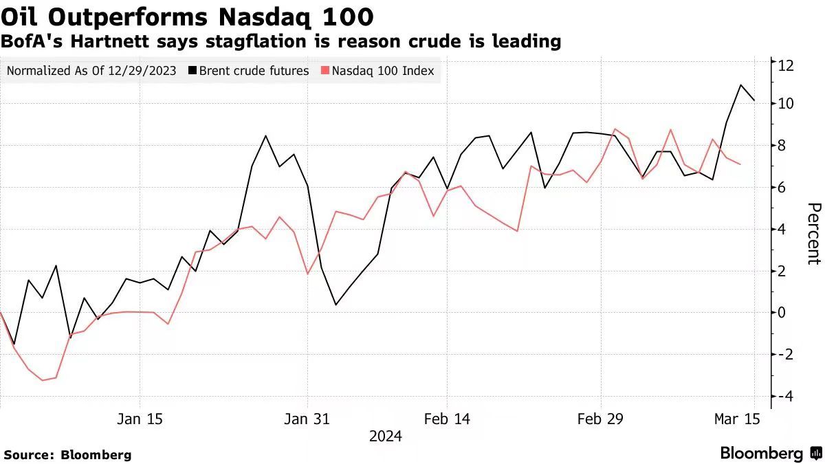 Hartnett表示:“新一轮滞胀意味着黄金、大宗商品、加密货币、现金的表现将优于其他资产,美国国债收益率曲线大幅趋陡,对资源和防御型股票的买跌卖涨倾向将非常明显。”他指出,今年迄今为止,油价的表现优于纳斯达克100指数。