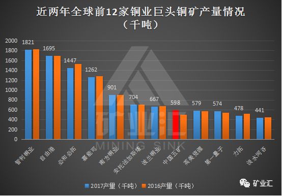 2017年全球铜矿产量预计为2000万吨,而全球前12强的铜矿公司产量合计超过1100万吨,占全球产量达55%以上,中矿企进入全球12强意义非凡。