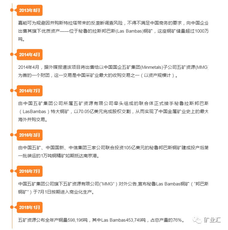2014年7月,由中国五矿集团公司所属五矿资源牵头组成的联合体以70.05亿美元接手秘鲁拉斯邦巴斯(LasBambas)特大铜矿,这是中国矿业走出去历史上交易额最大第一个项目。