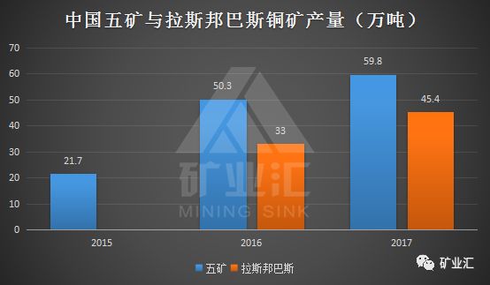 2015年,五矿铜产量仅有21.7万吨,但2017年,五矿铜产量达到59.8万吨,增长175.58%,其中,拉斯邦巴斯铜矿完成了首年满负荷生产,产铜45.4万吨,占五矿铜产量的75.92%。