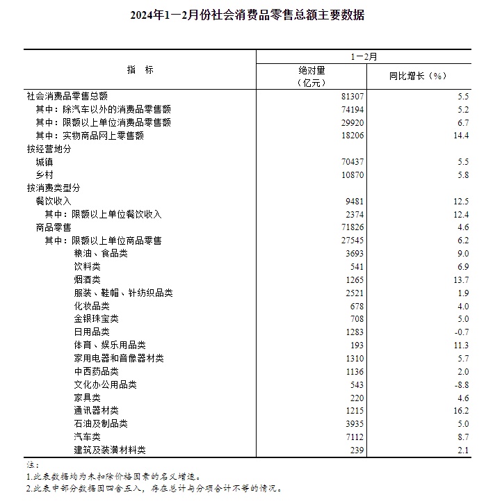 智通财经APP获悉,3月18日,国家统计局公布的数据显示,1—2月份,社会消费品零售总额81307亿元,同比增长5.5%。其中,除汽车以外的消费品零售额74194亿元,增长5.2%。按经营单位所在地分,1—2月份,城镇消费品零售额70437亿元,同比增长5.5%;乡村消费品零售额10870亿元,增长5.8%。按消费类型分,1—2月份,商品零售71826亿元,同比增长4.6%;餐饮收入9481亿元,增长12.5%。