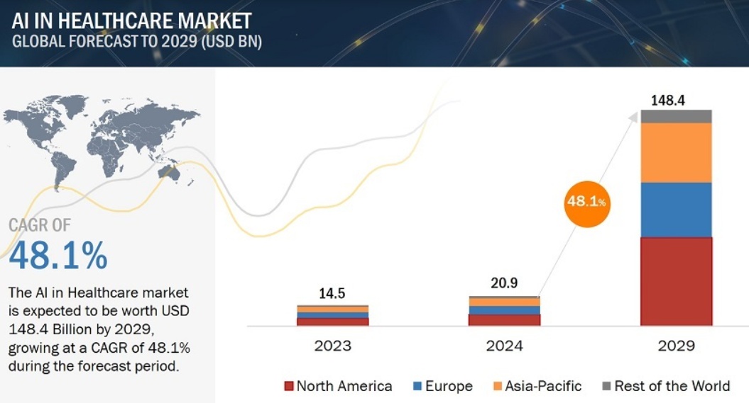 Markets And Markets最新研报显示,预计2024年融合AI技术的医疗保健市场价值仅仅约为209亿美元,预计2029年有望达到1484亿美元,在此期间的年复合增速(CAGR)高达48.1%,庞大的增幅主要基于人工智能技术在基因组学、药物发现、医疗成像和诊断方面大幅增长的需求潜力市场,以及大幅提高护士护理工作和处理医患交流工作方面的高效率促进医院大面积部署AI系统。